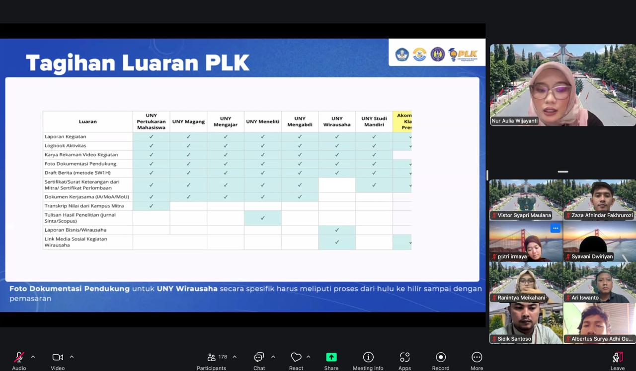 Kegiatan sosialisasi Program Pembelajaran Luar Kampus (PLK) Fakultas Ilmu Keolahragaan dan Kesehatan (FIKK) UNY diselenggarakan pada hari Rabu, 21 Januari 2026, melalui media pertemuan daring. Kegiatan ini dipimpin secara langsung oleh Dekan FIKK, Dr. Hedi Ardiyanto Hermawan, M.Pd., serta dihadiri oleh para Wakil Dekan dan seluruh Penanggung Jawab (PJ) program studi di lingkungan FIKK.
